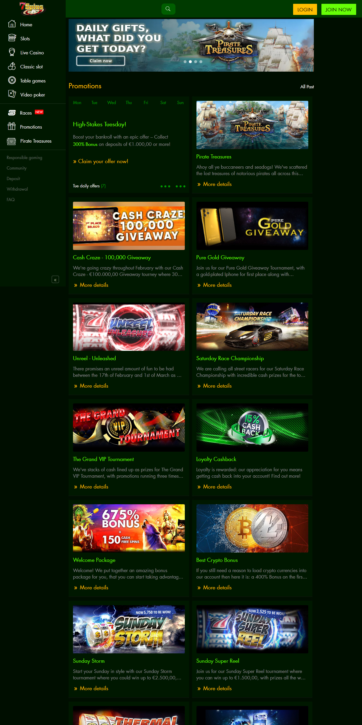 a confiança e a confiabilidade dos jogadores são os principais pilares que diferenciam 7 gira de seus colegas. termos e condições transparentes, opções de pagamento rápidas e seguras, uma infinidade de jogos de quatro fornecedores e um extenso programa de bônus servem como motivos claros para se inscrever no cassino online e jogar lá. juntamente com centenas de jogos, os jogadores podem se entregar a inúmeros torneios que cobrem todos os jogadores: os iniciantes recebem um novo e empolgante torneio semanal de jogadores, os altos rolos podem se juntar ao torneio gre vip, enquanto outros jogadores serão aceitos com prazer em qualquer outro evento competitivo, como a quinta -feira térmica ou o super reel freerolls. claro, 7 giros não são apenas torneios. trata -se de uma excelente e suave experiência no cassino em todas as categorias, desde jogos a bancos e opções de atendimento ao cliente. os jogadores da austrália são prontamente aceitos para se juntar à diversão.