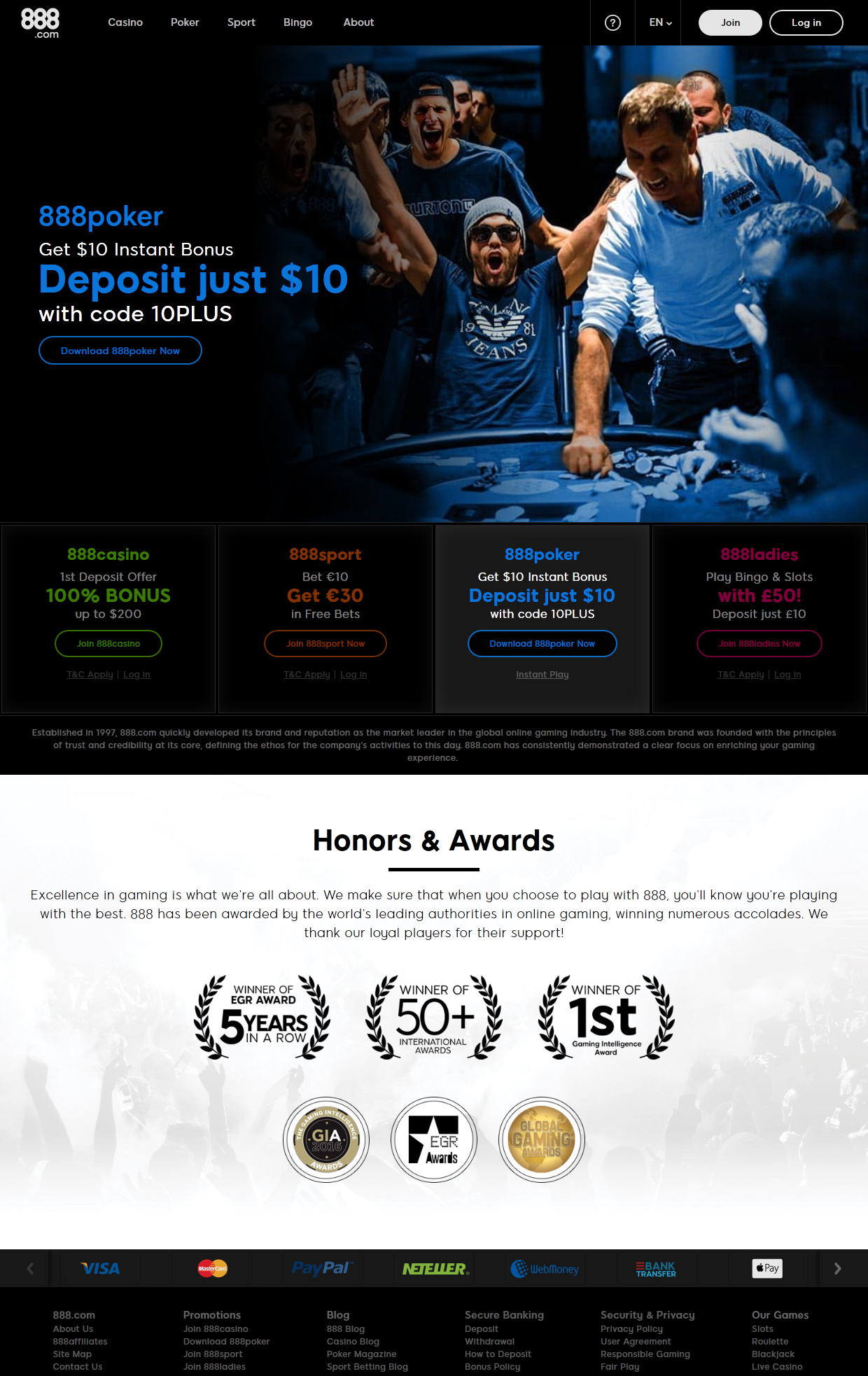 Por muitos anos de negócios, o 888 Casino foi recompensado com inúmeros elogios do setor que servem como outro forte argumento de por que os usuários da Portugal devem se inscrever e jogar lá. Os prêmios por excelência incluem o EGR Best Operator 2013, o melhor operador digital 2014 e outros. Os jogadores podem ter certeza de que o cassino on -line é completamente seguro e justo, que se manifesta por vários prêmios socialmente relevantes. Por exemplo, o 888 Casino se orgulha de ganhar o EGR Awards por 8 anos seguidos. Se os jogadores precisarem de ajuda, eles podem entrar em contato com o cassino por telefone ou soltar uma linha por e -mail a qualquer momento.Obtenha até US € 1500 bônus!