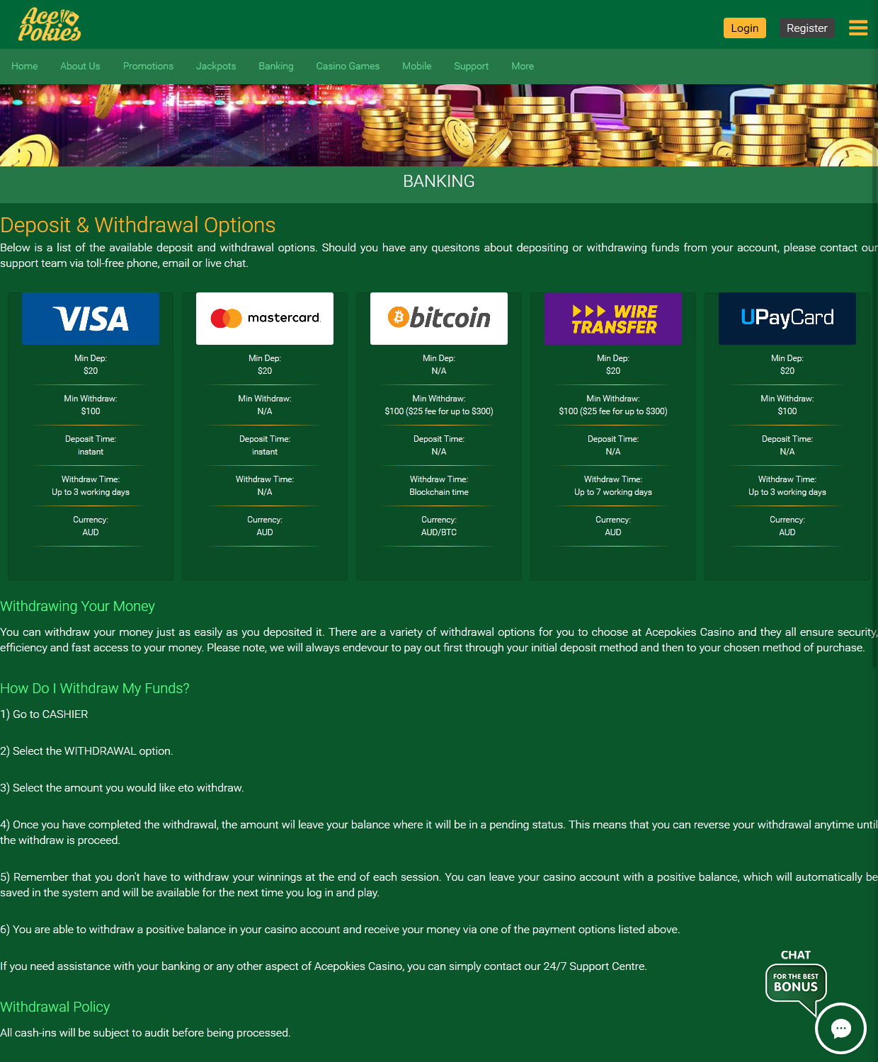 ace Pokies tem uma ampla seleção de mais de 200 jogos alimentados pela rtg. variando de Pokies a blackjack, eles oferecem diversão final, porcentagem de pagamento alto e toneladas de recursos de bônus para jogadores da austrália que teriam concluído o processo de inscrição simples e jogado por dinheiro real. o site tem um design elegante com a paleta de cores verde dominando o esquema visual e uma navegação intuitiva para permitir que todos navegassem pelo site do cassino da maneira mais eficiente e segura. a ace Pokies possui um extenso programa de bônus que atualmente totaliza mais de 10 promoções direcionadas a iniciantes e apostadores leais.