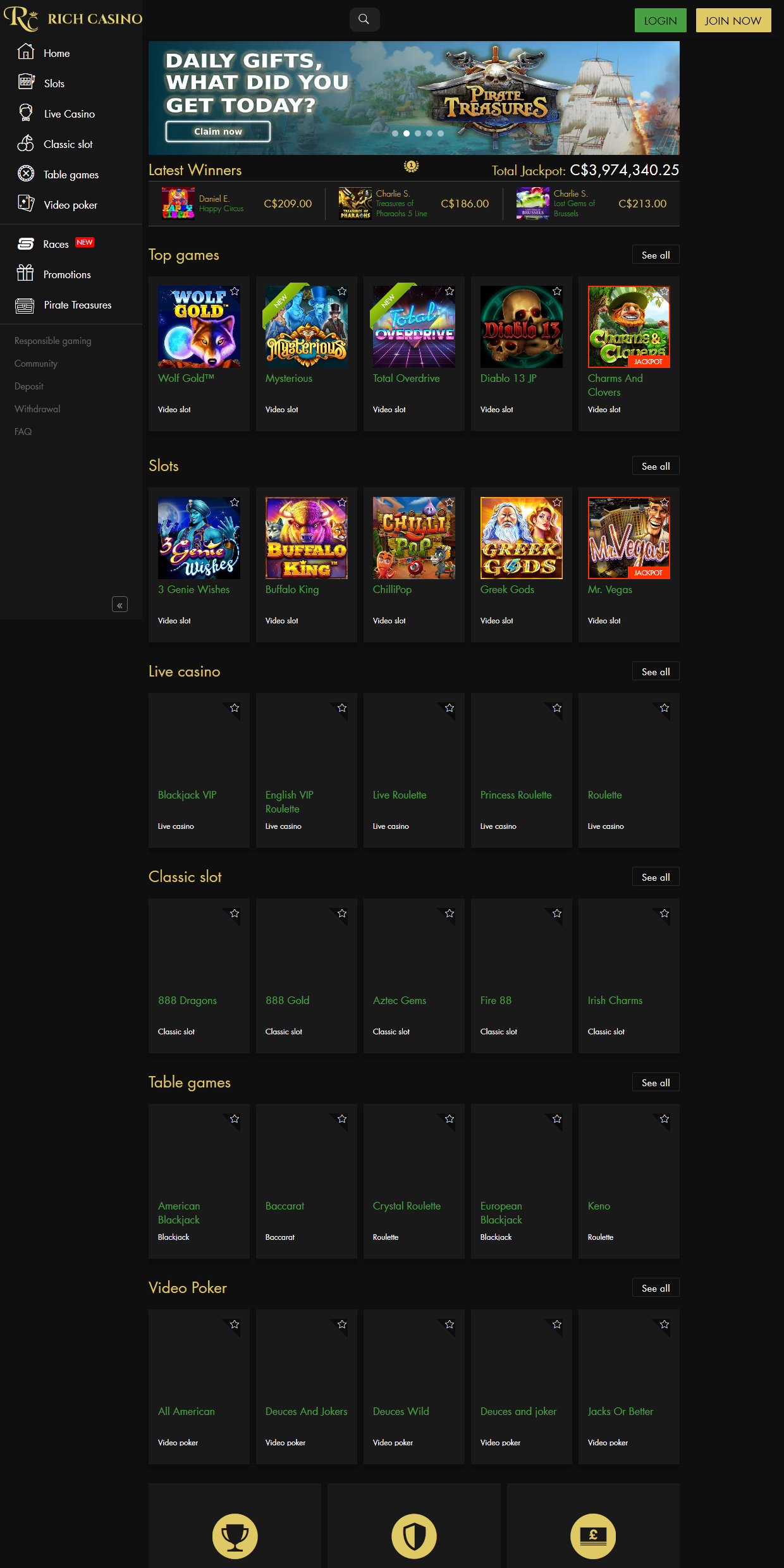 O Rich Casino tem um design elegante e atraente, com fundo preto sólido e bloco de menus à esquerda. Quando está na página inicial, um jogador pode ver links rápidos para os melhores jogos, Pokies recomendados e outro conteúdo do jogo. Na faixa superior, existem algumas promoções alternadas que destacam um bônus da moda ou um Pokie recentemente lançado. Em geral, o design da web visual do site do cassino é bom - não há nada extraordinário nisso, mas parece agradável aos olhos. Além disso, possui interface intuitiva e dois canais de suporte para resolver qualquer problema, se houver. Não há necessidade de baixar nada para jogar no Rich Casino, porque o site oferece uma experiência baseada em navegador com acesso instantâneo aos jogos. Os procedimentos de inscrição são padrão do setor e levam alguns minutos para serem concluídos.Ganhe até US € 12000!