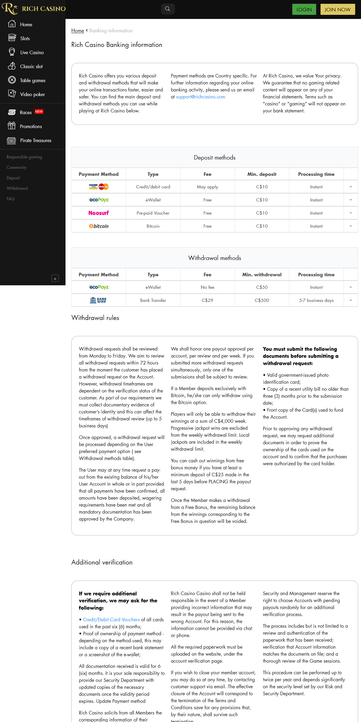 como é o caso em muitos outros sites de jogo, os métodos de retirada em cassino rico não são numerosos. atualmente, eles incluem apenas três métodos como Bitcoin, ecopayz e bank wire. entre os três métodos, apenas a transferência bancária exige uma taxa de us € 23, enquanto outros métodos são absolutamente gratuitos. a retirada min para transferência bancária é de us € 500, enquanto outras opções são mais amigáveis, pois um usuário da nova zelândia pode sacar no mínimo us € 50 (ou uma soma equivalente em Bitcoins). todos os pedidos de caixa são processados dentro de 3 dias e a transação máxima permitida pelo cassino é de us € 4000 por semana.
