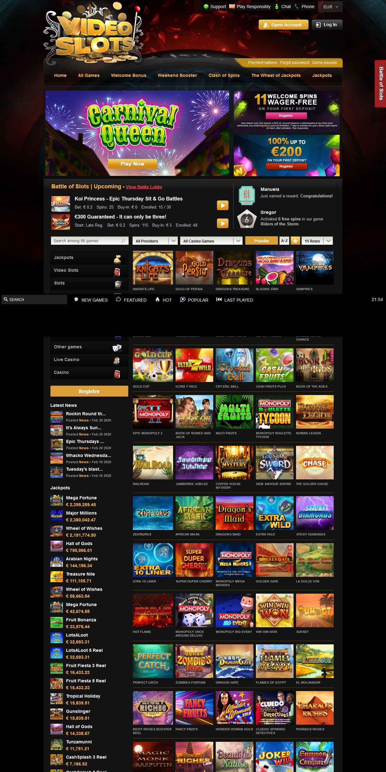 O cassino oferece muito conteúdo complementar que adiciona diversão e diversidade ao processo de jogo de rotina. Como exemplo, há uma opção de reforço de fim de semana que um jogador pode ativar a qualquer momento para permitir que o cassino retenha 0,5% do lucro do jogador e depois reembolsá -lo a cada sexta -feira. Essa opção incomum permitirá que os jogadores controlem melhor seu orçamento e entrem em um fim de semana com algum dinheiro extra. Outra atividade emocionante é conhecida como a roda dos jackpots. Os jogadores registrados completam várias conquistas, ganham troféus e progrediram nos níveis de XP. Para cada quinto nível XP, o cassino concede uma rotação em uma das rodas, dependendo do nível do cliente: madeira, bronze, prata, roda de diamante, etc. Cada roda esconde diferentes prêmios por trás, incluindo mega, maiores e menores jackpots. Esses e outros bônus de cair o queixo estão disponíveis para usuários da PT registrados (alguns exigem opt-in).Obtenha bônus até US € 200!