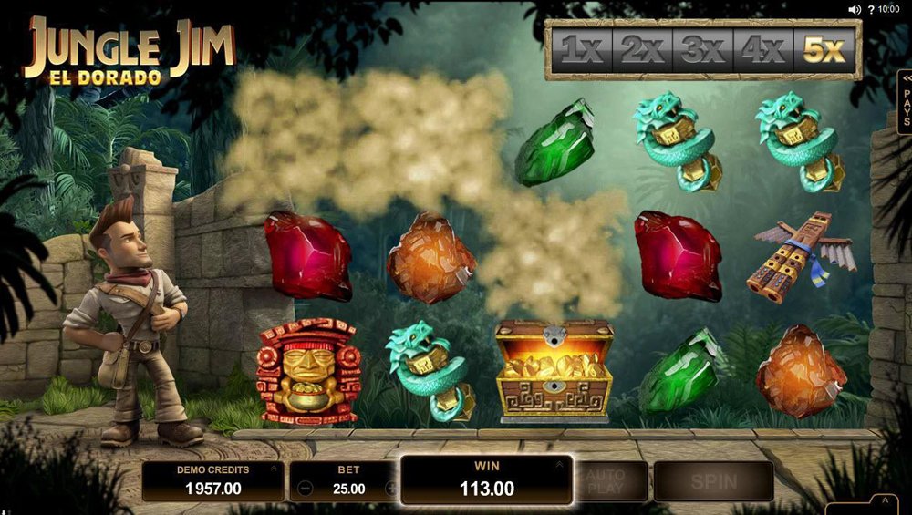este é um dos Pokies mais elaborados da microgaming em relação ao visual e você pode se deliciar com os olhos. os quinze símbolos dispostos em uma grade de 5x3 parecem estar no ar, contra a imagem da selva nos bastidores. jim, o personagem principal do pokie, sempre fica à esquerda e é animado ao longo do jogo; às vezes, ele bebe água de seu frasco, dá um tapa em um mosquito que pousa em seu rosto, dá um polegar para cima quando uma grande vitória chega e faz outras ações, colocando você com o clima certo para este pokie. ao contrário de muitos outros Pokies com bobinas giratórias, os símbolos nesse pokie simplesmente caem em posição de uma maneira semelhante a avalanche.