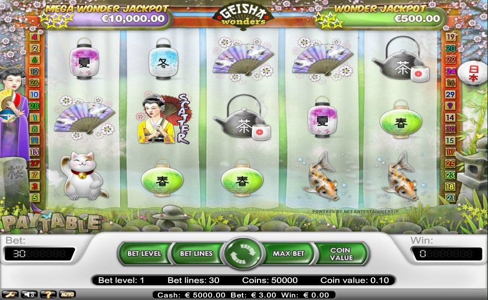 este pokie de 5-rel 30-payline possui símbolos detalhados que incluem quatro lanternas como símbolos de baixa vitória e cinco símbolos temáticos, como um fã japonês (us € 300 por cinco do tipo), um bule de chá (us € 500), uma árvore de bonsai (us € 600) , um koi (us € 1000) e uma estatueta de gatos (us € 2000). todos esses símbolos pagam da esquerda para a direita em uma linha de pagamento, como muitos outros Pokies baseados em payline. os tamanhos da aposta começam em us € 0,30 e custam us € 60 por spin.